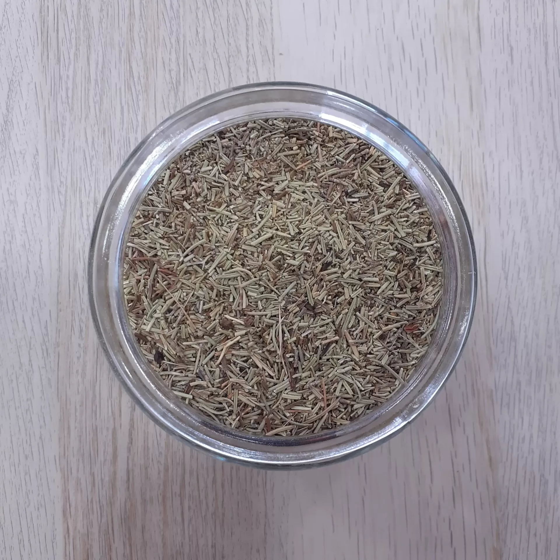 Frasco redondo com ervas secas verdes e castanhas visto de cima