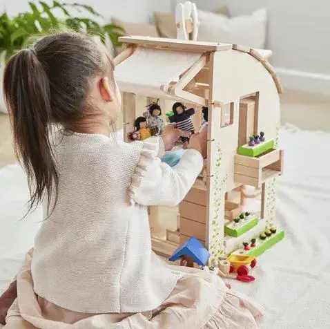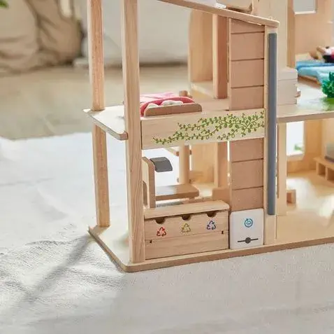 Com a casa de bonecas verde as crianças aprendem sobre a importância de uma vida sustentável com uma casa que tem uma turbina de vento, um painél solar, um inversor eléctrico, recipientes para reciclagem, recipiente para aproveitar água das chuvas, um toldo que pode ajustar a quantidade de luz solar e circulação de ar. 🌿