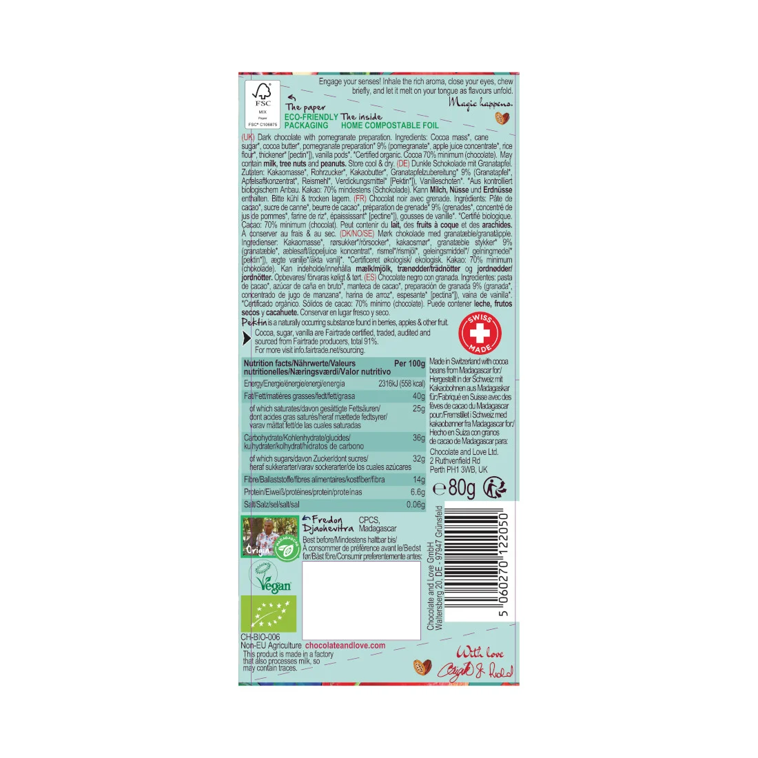 Chocolate Vegan BIO com Romã e 70% de Cacau 80g - Chocolate & Love
