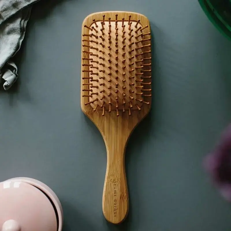 Escova de cabelo Grums com base de borracha natural e cabo e dentes 100% de bambu. Não cria eletricidade estática durante a escovagem do cabelo, evitando a perda de cabelo saudável. Uma ótima alternativa às escovas de cabelo que têm plástico na sua composição e que ainda não possuem uma alternativa viável de descarte após o uso.