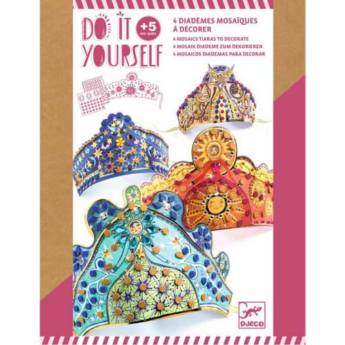 Conteúdo da embalagem: 4 tiaras de cartão ilustradas, 3 folhas de autocolantes de espuma brilhante em mosaico, 4 folhas de autocolantes de "pedras preciosas", 4 fitas douradas, 1 folheto de instruções.