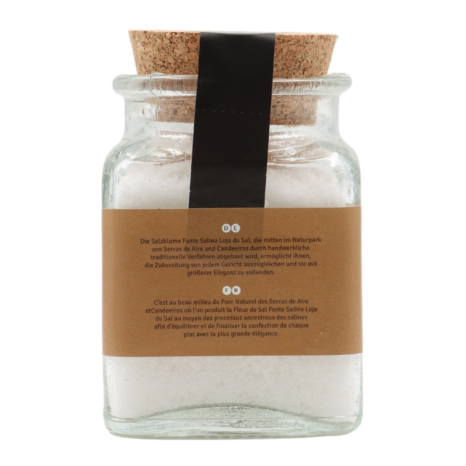 Embalagem: Frasco de vidro e tampa de cortiça, 225g de flor de sal.