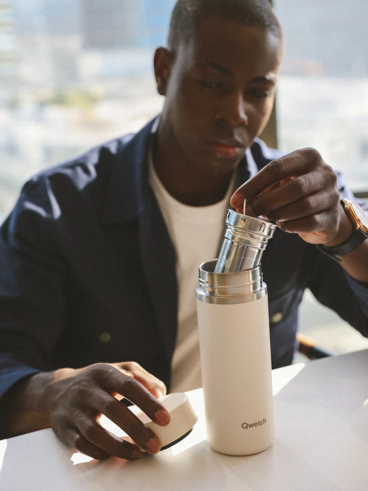 Adequada para utilização em qualquer lugar, a garrafa de chá térmica areia Qwetch com filtro de infusão incluído, permite preparar a infusão diretamente na garrafa.