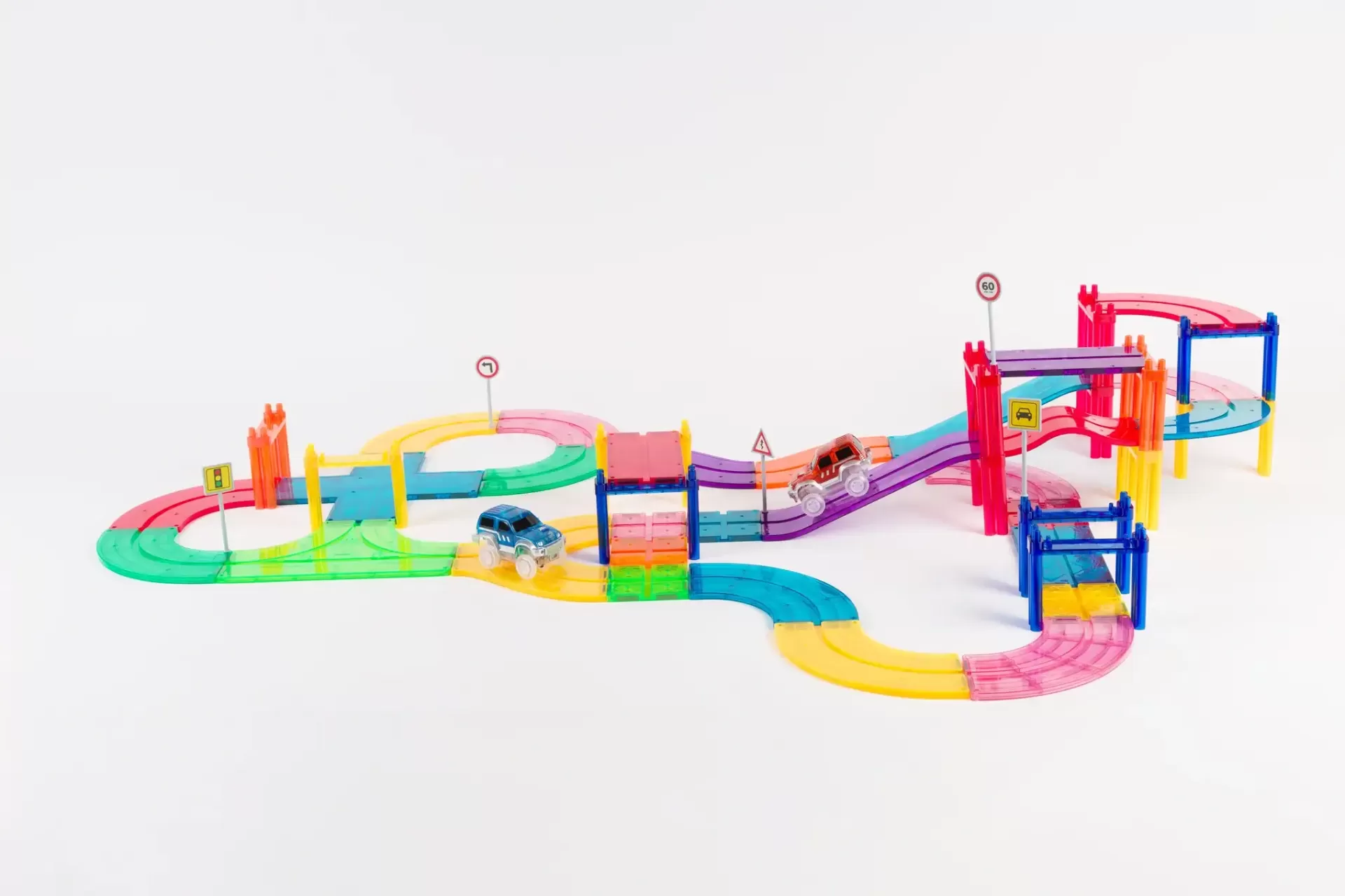 Com este conjunto é possível criar circuitos com saltos e obstáculos, ou circuitos rápidos e retos para alcançar velocidades rápidas. 🚗