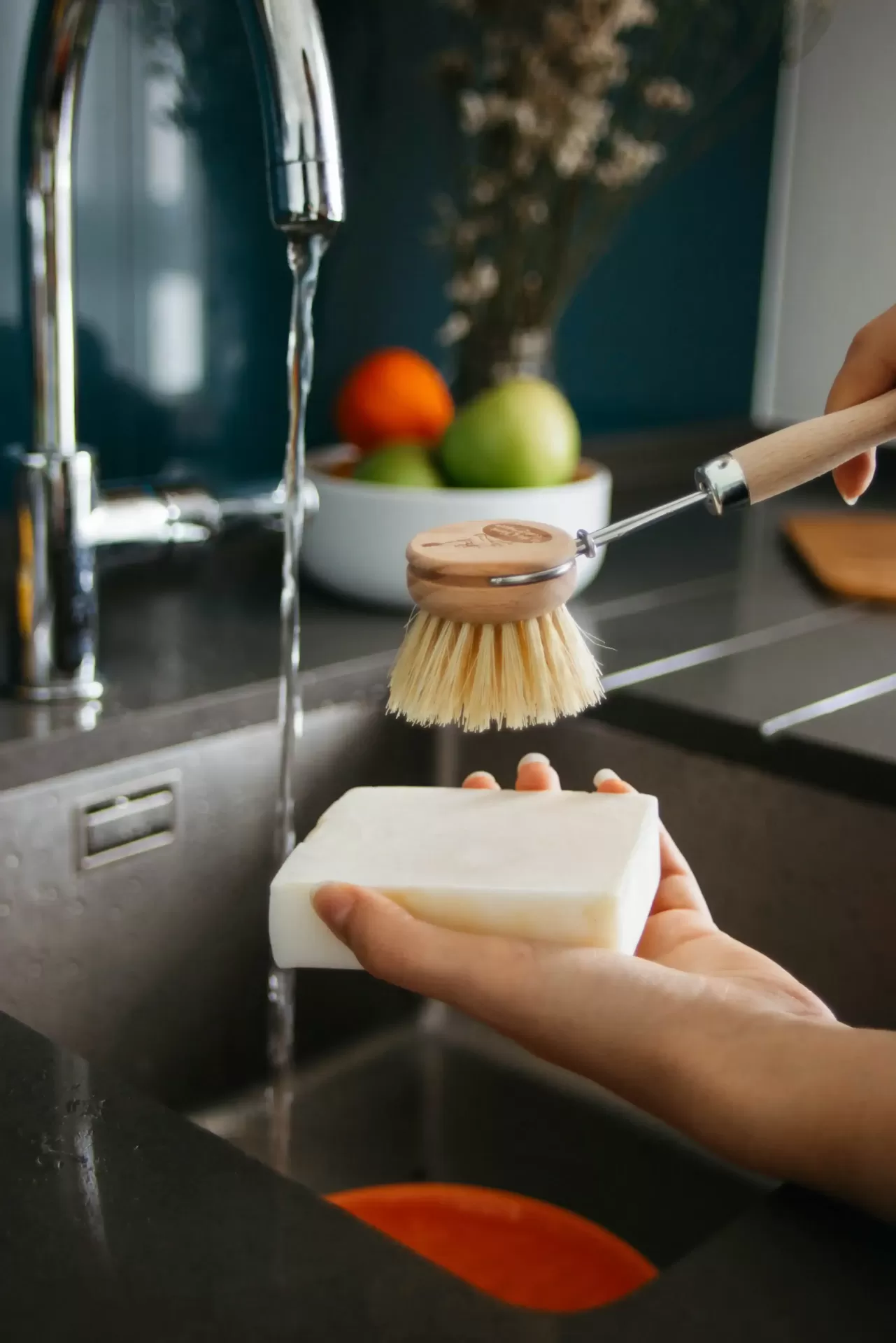 Modo de utilização: Com a esponja ou a escova da loiça molhada esfregue no sabão para criar espuma. Após o uso guardar num local seco.