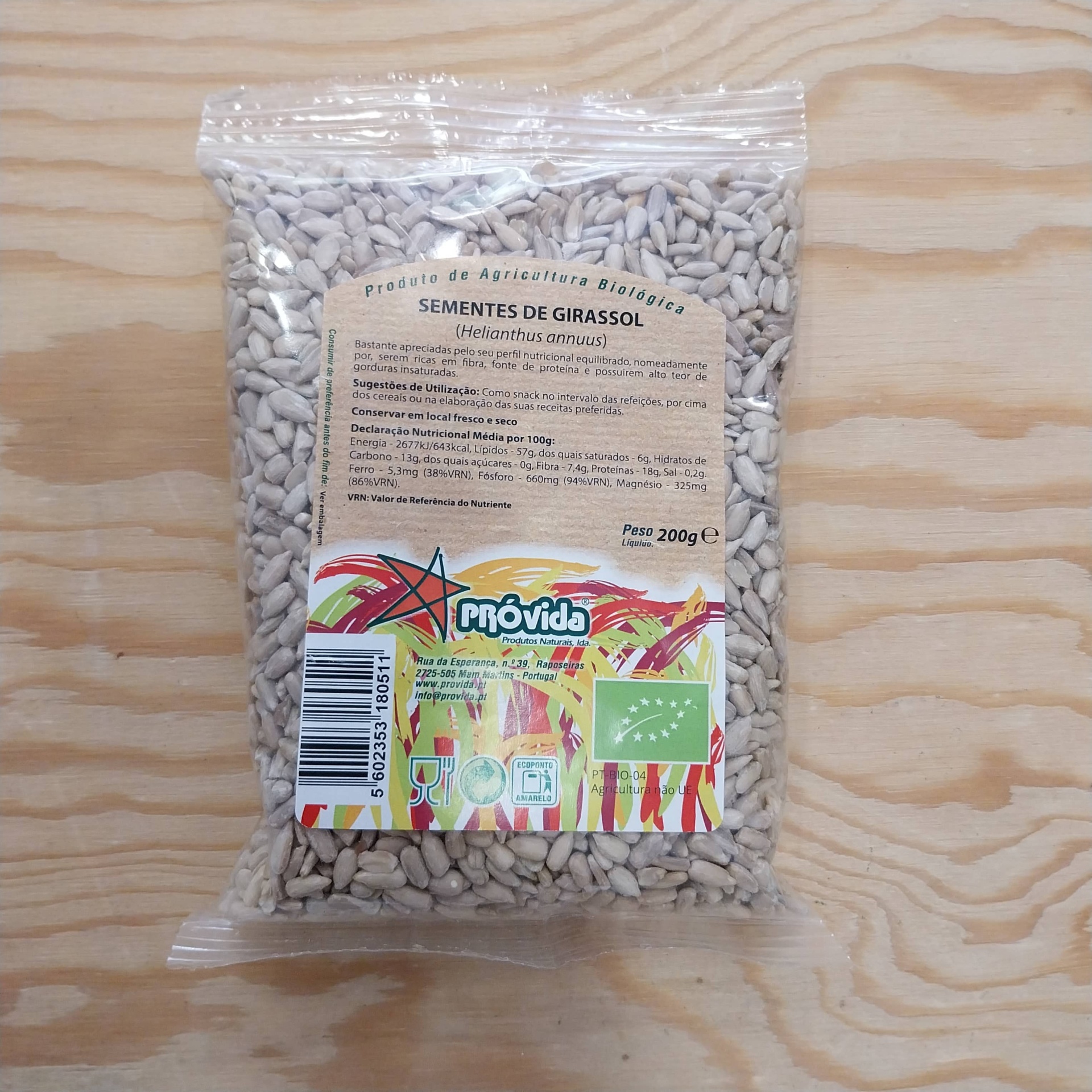 Declaração Nutricional por 100g: Energia - 2521kJ/610kcal; Lípidos - 51,5g; dos quais saturados - 4,5g; dos quais monoinsaturados - 18,5g; dos quais plinsaturados - 23,1g; Hidratos de Carbono - 11,4g; dos quais açúcares - 2,6g; Fibra - 8,6g; Proteínas - 20,8; Sal - 0,02g; Ferro - 5,3mg (38%VRN*); Fósforo - 660mg (94%VRN*); Magnésio - 325mg (86%VRN*). *VRN - Valor de referência do nutriente.