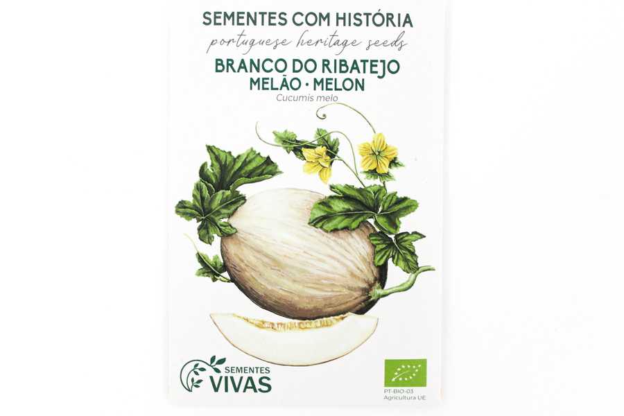 Sementes de Melão Branco do Ribatejo. O melão branco português, famoso pela sua doçura e pelo sabor cheio a fazer lembrar campos repletos de sol.